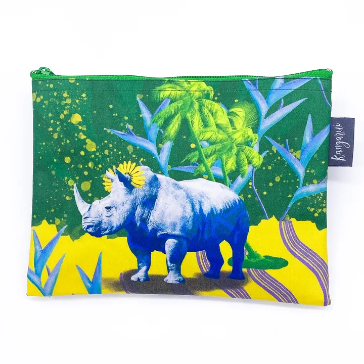 タイトルは、 ”バナナ ライノ”。 グリーンとイエローのカラーをメインに作ったサイのアート。 バナナを耳の辺りに飾ったオシャレなサイをプリントしたポーチです。 ちょっぴりトリケラトップスのような恐竜っぽい雰囲気になっています。 化粧ポーチ、筆箱、レシート入れやクラッチとしてなど色々な使い方ができるポーチです。 あなたのバッグの中の小物を整理するのにとても便利!素材は汚れに強い日本製ラミネートコットンです。つや消しコーティング。 サイズ:縦14.5cm×横20cm 重量:30g