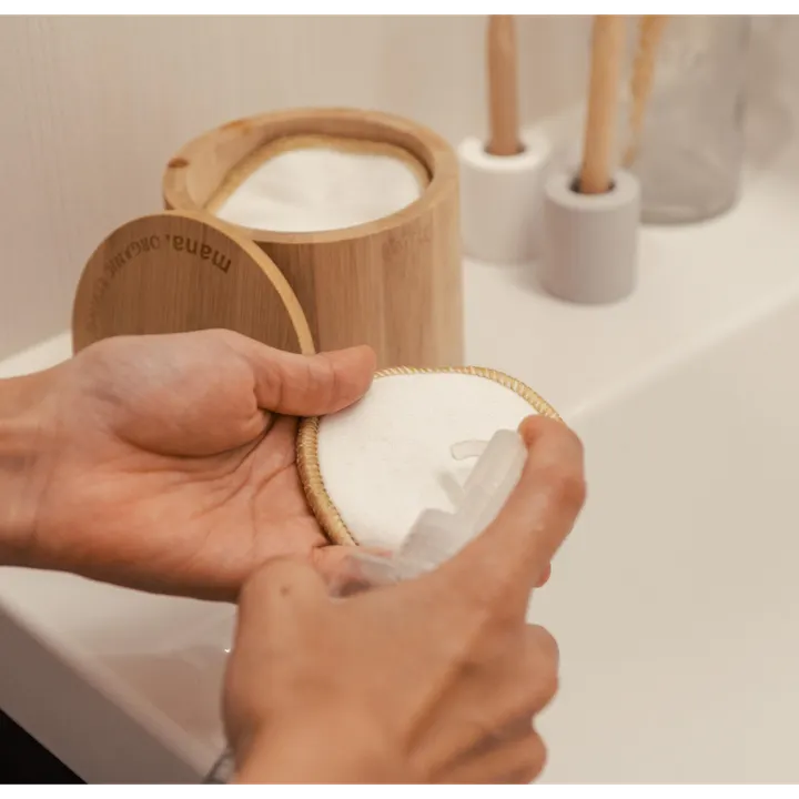 コットンパッド20枚、専用ネット、竹ケースのセット 竹繊維を原料としたレーヨンとコットンでできた洗って繰り返し使用できるコットンパッド。使い捨て化粧パッドに見られる毛羽立ちがなく、ふわふわな肌触りで地球にもお肌にも優しい。毎日の化粧落としや化粧水利用の際にご活用いただけます。付属の専用ネットはポーチ使いや、パッドを入れて通常のお洗濯と一緒に洗うことで繰り返し使用することができます。竹ケースに保管するとインテリアにもなり、いつでも取り出すことができます。上品な2色カラーのパッド。