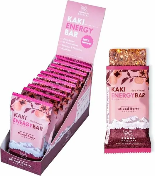=パッケージに原材料英語表記あり= フランボワーズのコク深いベリーの風味と、クランベリーの爽やかな酸味。酸っぱすぎず、華やかすぎない落ち着いたベリーフレーバーは。誰にでも親しみやすい味わいです。まるでベリーのスイーツを食べているような味と甘味のバランス感は、仕事の合間のおやつにもぴったりです。 ☆KAKI ENERGY BARの楽しみかた☆ ・仕事の合間のおやつに ・スポーツの間の栄養補給に ・忙しい朝の朝食として ・アウトドアの登山食に アクティブなあなたのライフスタイルにナチュラルでやさしいおいしさと栄養を ☆こだわり☆ ALL NATURAL / NO ADDED SUGAR / HIGH FIBER / VEGAN 原材料を厳選 ・100%ナチュラル 着色料・化学香料・甘味料・砂糖・動物性原材料全て不使用。シンプルな素材だからこそ、味にもクオリティにも妥協しません。全てが植物、自然由来の素材からできているナチュラルでピュアな味をお楽しみください。 ☆庄内の特産品を使用☆ 庄内地方で100年以上生産されている庄内柿の「干し柿」。出羽三山から広がる清らかな土壌、空気、水で育った、有機栽培玄米を発芽させ粉末にした「有機発芽玄米粉」。地元の自然の恵みから生まれる素材を、余すことなく使います。 ☆カラダにうれしい栄養をそのまま☆ ナッツのプロテイン、柿の食物繊維、発芽玄米のミネラルやビタミンなど、さまざまな栄養が1本にぎっしり詰まっています。自然の素材から生まれるしっとりとした口当たりと深い旨み。アクティビティの合間にも、いつものおやつとしても。様々なライフスタイルに、手軽に楽しめる“おいしさと栄養”を追求しました。
