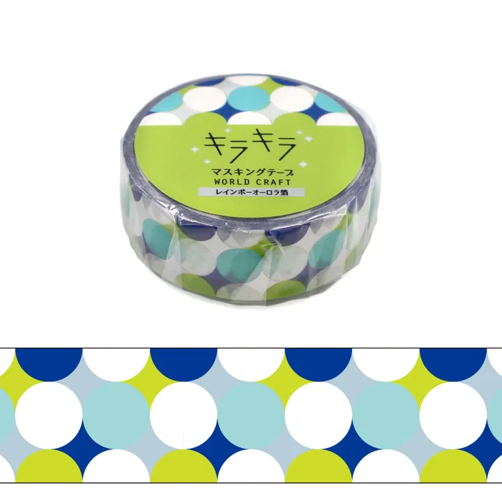 【 キラキラマスキングテープ 15mm Dot】  ★★ 箔を使用した、キラキラが可愛いキラキラマスキングテープ 〜 第5弾 Lights、Geometric、Flowers の3つをテーマに <12柄> を揃えました ★★ 上下に重ねて貼れるデザインがポイントの丸の総柄デザインです。 鮮やかなブルーとライトブルー、そして ライムグリーンの配色がクールで、まさに夏にぴったりです♪ 『レインボーオーロラ箔』 を使用しています♪