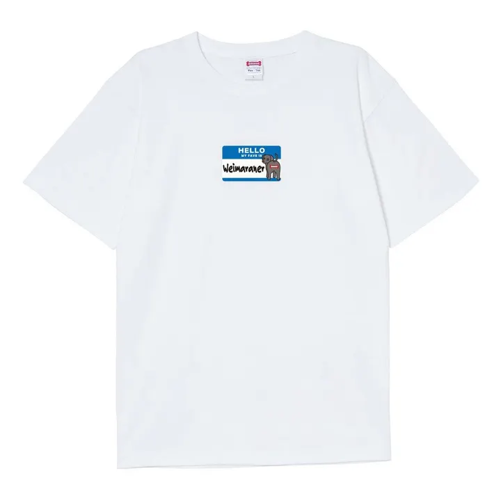 "HELLO MY FAVE IS Weimaraner" 「こんにちは。私の推しはワイマラナーです。」 デザインの元になっているのは海外のパーティーなどで名刺の代わりに使われることが多い、"HELLO MY NAME IS"ステッカー。 はじめましての挨拶に使われるステッカーをデザインに使うことで、Tシャツを着ることで自分のお気に入りのワンちゃんを伝えられればいいなと思い作ったTシャツです。 Tシャツのボディーは、100%コットンで6.2ozの着心地の良い厚めの素材を使用。 首もとの縫製には、ステッチを2本施すことによって首もとの伸びを抑えることができるダブルステッチ縫製を採用。 長い間、着心地良く着ていただける素材を選びました。 このTシャツを着て【ワイマラナー】好きをアピールしましょう! サイズ展開- S/M/L/XL 身丈- 63/68/72/75 身幅- 47/52/55/60 肩幅- 42/46/50/55 袖丈- 18/22/22/23 素材- 綿100% Printed in JAPAN Illusted by hoppe https://www.instagram.com/hoppe_illust/