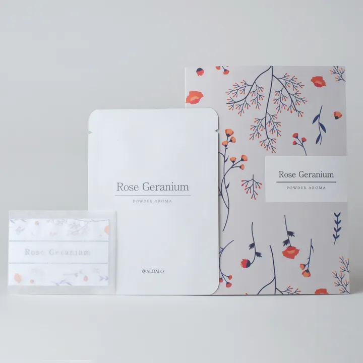 女性に人気のやさしい花の香り アロマ業界初粉末アロマ「POWDER AROMA」をシート状に加工、アルミ袋で密封した商品で精油を最後の1滴まで有効に使用した商品です。 器具不用で袋を開封するだけの簡単アロマ、サシェや匂い袋の様にご使用ください。 アルミ袋を開封しない限り芳香しない袋入り商品で、在庫管理もしやすくなりました。 プチギフトにも人気の商品です。 【精油詳細】以下の精油を粉末加工しています。 学名:Pelargonium x asperum 原産国:フランス 抽出方法/部位:水蒸気蒸留法/花葉 ※原産国は、予告なしに変更になる場合があります。