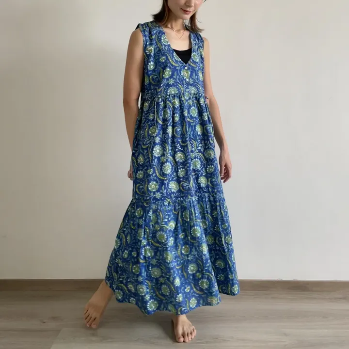 • • • • • • • • • • • • • • • • • • • • • / 重ね着できる万能ワンピース \ 深めのネックと広めのアームホールでTシャツやブラウスなどを重ね着してジャンパースカート風にも楽しめるデザインにしました。 暑い時期はキャミインナーを中に着てラフ感あるコーデになります!インド綿100%の裏地付きなのでペチコート等は不要です◎ 4本のウエスト紐をサイド or 前後で結んで体型に合わせてウエストマークもできます。 ポケット・裏地付きで着心地・利便性も◎ * 胸元のボタンホールはインドの縫い子さんによる手縫いで仕上げられたものものもございます。 • • • • • • • • • • • • • • • • • • • • • ▶︎ One size ▶︎ Size 平置きサイズ、着用モデル身長167cm (普段M-Lサイズを着用) - 総丈 130cm / バスト幅50cm / ウエスト幅52cm / 肩幅34cm / アームホール25.5cm * 上記のサイズ±0.5〜1.5cm 差がある場合もございます。 * 総丈以外のサイズは120cm丈、130cm丈どちらも同じです。 ▶︎ 素材 - 生地 : インド綿 100%、ブロックプリント - ボタン : 貝ボタン ▶︎ 生産 - インド パートナー工場 ▶︎仕様 - ポケット / 裏地付き (インド綿100%) • • • • • • • • • • • • • • • • • • • • • ▶︎お手入れ方法 *着用前に一度水通し(冷水で)をしてください。 |洗い方 ブロックプリント生地は色落ちの可能性がありますので、水(お湯ではなく冷水)での単品洗い・手洗いをおすすめします(お湯で洗うと縮んでしまう可能性があります)。強く擦って洗うとプリントが落ちる恐れがありますので、優しく手洗い・押し洗いしてください。 |干し方 縮んでしまうので乾燥機は使用しないでください。 色褪せ防止のため、陽の当たらないところで干してください。 • • • • • • • • • • • • • • • • • • • • • ブロックプリント生地の風合いについて 一回一回、職人さんが木版を押して出来上がる生地のためマシーンプリントやスクリーンプリントとは異なりプリントのかすれ・ズレ・色ムラ・インクの跳ねなどがございます。ブロックプリントならではの手作りの温もりをお楽しみください。 ブロックプリントの風合い・柄の出方は1点ごとに異なり、柄が左右完全対照でないこともございます。ブロックプリントの風合いをご理解いただいた上でのご購入をお願いいたします。 • • • • • • • • • • • • • • • • • • • • • 各色柄・サイズ3-5着の販売。インド現地で入手できる生地はその時で変動があるため、増産予定はありません。 インドの職人さんが一つ一つ丁寧に縫製してくれていますが、数mm縫製のズレがある場合がございます。 生地に着用・洗濯に問題ない小さな織り傷がある場合もございます。 • • • • • • • • • • • • • • • • • • • • •