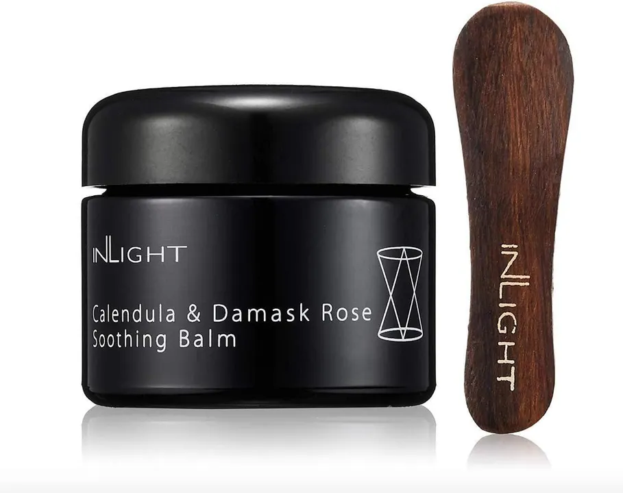 容器は、可視光線を透過させない長期保管に優れた” MIRONバイオレットガラス”バーム付属のローズウッドスパチュラは菌の繁殖に強いインドとのフェアトレード製品。