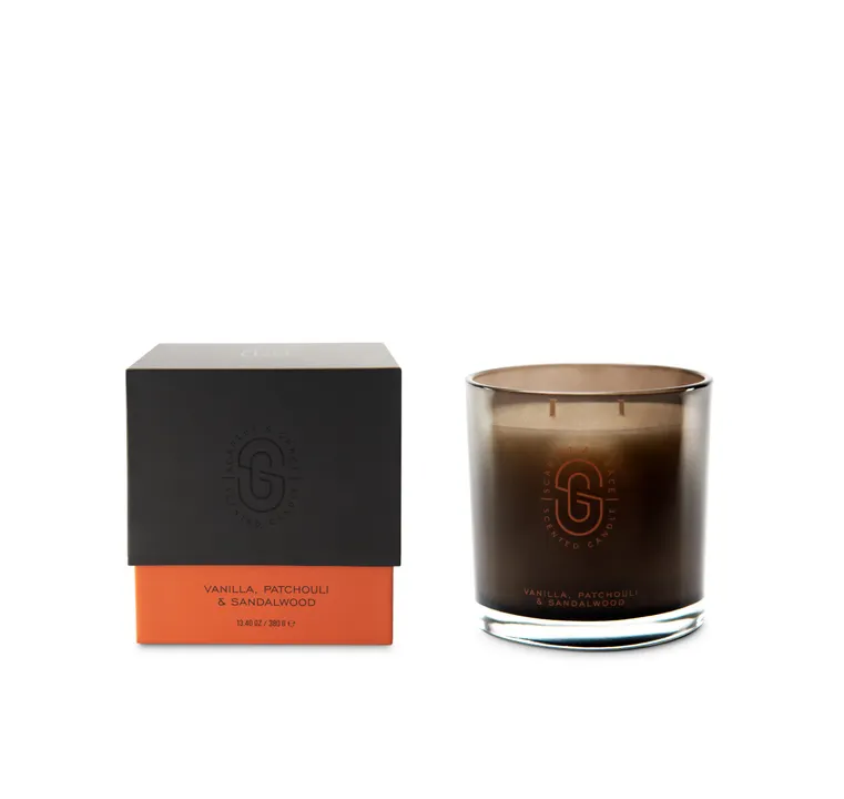 【グラス入りソイキャンドル ダブルウィック】 鉛や金属を含まないコットンウィック/ピュアフレグランスオイル使用/オーストラリア産最高級原料 バニラ、パチョリ&サンダルウッド