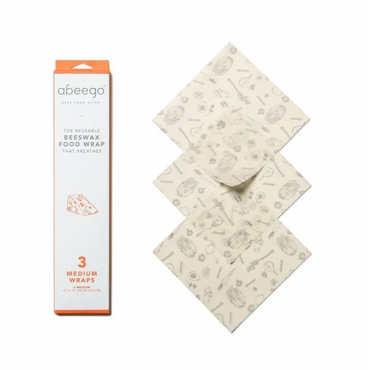※本国でのブランド終了に伴い、在庫限り販売終了となります。 ※こちらの商品はパッケージに箱潰れ等のダメージが見受けられ、また旧デザインのため、お買い求めいただきやすい価格でご案内しております。商品自体は現行品と変わりません。 【ミディアム 3枚セット】 使いかけのお野菜や、庭で摘んだハーブの保存にオススメのミディアムサイズ3枚セット。 食べかけのチーズの保存にも最適です。 袋状に成型して使用することもできます。 \\ ナチュラルでサステイナブルなabeegoのビーズワックスラップを使用して、              健康的で地球にも優しい食生活を送りませんか? // 【100%天然素材のみで作られた新しいかたちの食品保存用のラップ】 ”生きている食べ物の摂取=リビングフード※“が注目される中、 その保存方法を巡り、ラップされた食材に呼吸をさせることができ、 また健康的で地球に優しい保存方法が無いかと考え出されました! ※野菜や果物等の生きている酵素や栄養素を積極的に取り入れる、世界で注目されている食事法 生地を使うことで、一般的な使い捨てのラップフィルムにはない、程よい通気性を保ち、 ミツロウやホホバオイルの天然の保湿性と抗菌性により、包んだ食品の鮮度を長持ちさせます。 その結果、食品に含まれる栄養素だけでなく、 その栄養素を身体に吸収し消化・代謝を促すために不可欠な酵素の持ちも、各段に良くなるのです。 使い方もいたって、シンプル。 冷水で手洗い後、乾かしていただくだけ! 身近なところから、「シングルユース=使い捨て」を減らしていきませんか? ――――――――――――――――― こんな方にオススメ! ☑環境問題に関心の高い方 →このビーズワックスラップを使用し、食品の持ちが良くなる事で、フードロス削減にも一役買います。冷水での手洗いで、約1年ほど繰り返し使用可能です。また最後は、土に還し堆肥にすることも出来ます。 ☑エコやサステナブルな生活をこれから始めたい方 →abeegoのビーズワックスラップを使用することで、ラップフィルムゴミを減らすことが出来ます。お手入れや保管も容易なので、毎日の生活にすぐに取り入れられます◎ ☑健康に配慮されている方 →包んだ食品の鮮度を長持ちさせ、食品に含まれる栄養素と酵素の持ちが格段に良くなります。 ☑大切な方へのプレゼントに ―――――――――――――――――