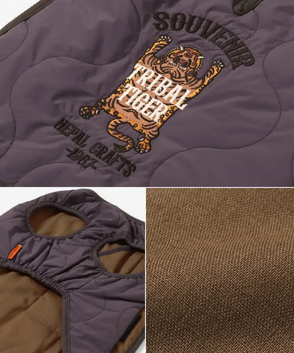 《KRIFF MAYER 秋冬人気アイテム「スーベニア刺繍キルトJK」がドッグウェアで登場!》 中綿入りのひょうたんキルトを使ったジャケットです。 バックに配した、タイガーラグモチーフのオリジナル刺繍技法を落とし込んだギミックが特徴的なデザインです。 アウターのイメージで着用していただきたいので、中に何か着れるように ゆったりワイドなシルエットになっています! そして一番の特徴は、おくるみシステム! 前足を通すと、後はぐるっとくるんで面ファスナーでとめるだけ! 暴れん坊なわんちゃんでも簡単に着用できます! 同コンセプトのオーナーアイテム(品番:2415104)も展開していますのでお揃いがお楽しみいただけます。 ※ハーネス穴あり ※服のサイズをよくお確かめください。