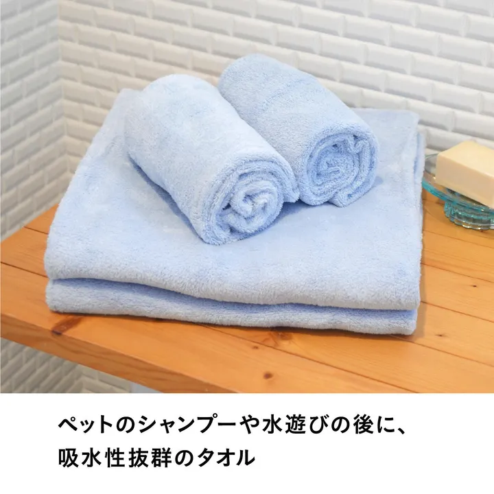 ペットに優しいふんわり抗菌タオル吸水・速乾性に優れたマイクロファイバー製なので、触れるだけでサッと吸水してくれてシャンプー後も素早くタオルドライをすることが出来ます。さらに雑菌の繁殖を抑える抗菌加工と、臭いを抑える消臭加工をプラスしました。ふんわり柔らかいので、わんちゃん猫ちゃんのベッドに敷いたり、移動用ゲージに一緒に入れておくのもおすすめです。