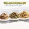 ○ごまかつお:いりごま(国内製造)、かつお削り節、醤油、食塩、ぶどう糖、砂糖、発酵調味料、酵母エキス、香辛料/調味料(アミノ酸等)、酸化 防止剤(V.E)、甘味料(ステビア)(一部に小麦・ごま・大豆を含む) ○ごまわさび:いりごま(国内製造)、食塩、糖類(砂糖、オリゴ糖)、わさびパウダー/調味料(アミノ酸等)、環状オリゴ糖、着色料(クチナシ)、香料、酸味料、香辛料抽出物(一部にごまを含む) ○ごまゆず:いりごま(国内製造)、たん白加水分解物、ゆず果汁(ゆず(高知県産))、糖類(砂糖、オリゴ糖)、食塩/調味料(アミノ酸)、香料、クチナシ色素(一部にごま・大豆を含む)