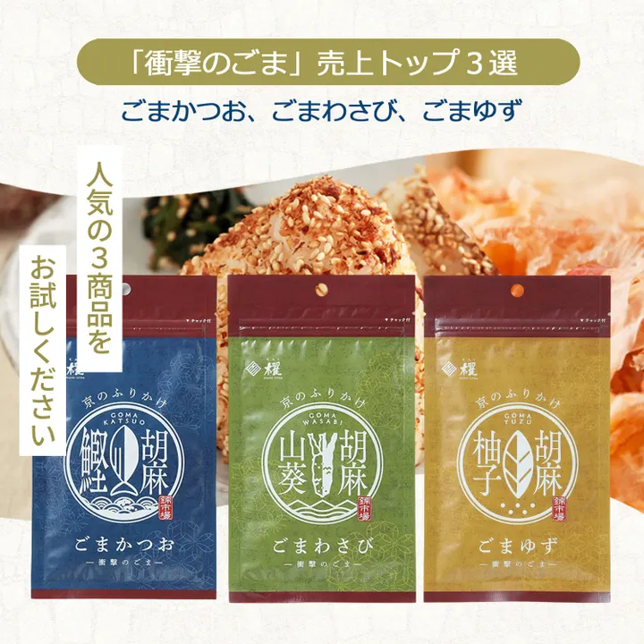 ”珍味処の京ふりかけ”「衝撃のごま」ふりかけシリーズ3個_売上トップ3 (ごまかつお40g|ごまわさび40g|ごまゆず40g)