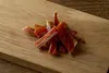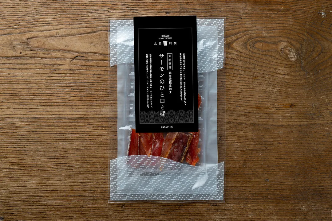 秋鮭を原料に背骨を取り除き3枚におろし、食べやすいように皮を剥きひとくちサイズに乾燥させたおつまみです。 北海道で獲れた新鮮で良質な水産物を使用し、素材の旨味を最大限に活かした珍味です。味付けには北海道産の昆布を使った昆布だしと昆布醤油、国産原料で作ったかつおだしとしいたけだし、根室で漁獲されたサンマを使用したさんま魚醤のこだわりの調味料を使用しています。