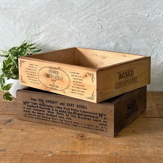 北海道 旭川市の自社工場で製作しています ちょうど良いサイズで家の中、ガーデニングと重宝すること間違いなし。 アンティークな雰囲気のロゴプリントがオシャレ プリントは、写真で見えている2面にのみ入っています。 ■商品サイズ 約 横幅280×奥行230×高さ80mm (板の厚みなどで、多少の誤差が出る場合があります) ■材質 北海道産パイン材を使用。底板は合板。 木目、色合いなどが1つ1つ違います。