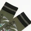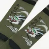 足元に宿る、日本の誇り。スカジャンの粋を靴下に。 明治の時代、世界を驚かせた日本の美意識「ジャポニスム」。今期のテーマでもあるその精神を現代に蘇らせた、特別な一足です。スカジャンの象徴的な存在である龍の刺繍を、職人の手によって靴下に落とし込みました。 カーキグリーンの落ち着いたボディに、力強く舞い上がる龍の姿。まるで足元にミニチュアのスカジャンを纏うような、遊び心あふれる逸品です。 日本で生まれた唯一の洋服、スカジャンへのオマージュ スカジャン(スーベニアジャケット)は、戦後の日本で生まれた唯一の洋服と言われています。駐留米兵の記念品として、鷲・虎・龍などのオリエンタルな刺繍を施したジャケットが始まりでした。 1950年代には米軍基地での正規納入品となり、やがて横須賀基地周辺で「スカジャン」として日本の若者にも愛されるように。この歴史的な衣服の美学を、現代の靴下に落とし込んだのが本作です。 細部に宿る、こだわりの美学 龍のモチーフに刻まれた「女利安」の文字。実はこれ、南蛮貿易時代にポルトガル語の「MEIAS(メイアス)」やスペイン語の「MEDIAS(メディアス)」から転じた言葉で、まさに「靴下」を意味する歴史ある言葉なのです。 履き口には、スカジャンの袖口を再現した起毛素材を採用。黒地にグレーのラインが入ったこの部分は、本物のスカジャンを彷彿とさせる仕上がりです。この歴史的な衣服の歴史を、1足に表現しました。 スタイリングの新たな可能性 デニムやチノパンの裾からチラリと覗かせれば、さりげない個性を演出できます。あえてサンダルと合わせて、和モダンな足元を楽しむのも粋な着こなし。普段のコーディネートに、ちょっとした遊び心と物語を加えてみませんか?