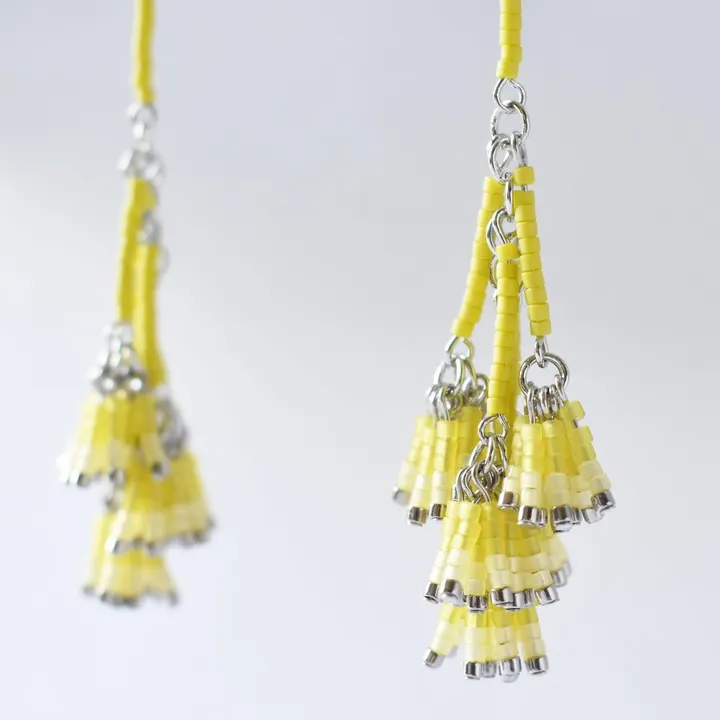 万葉の歌人 山上憶良が詠んだ 秋の七草のひとつとして知られるオミナエシ 秋空に向かってまっすぐに伸ばした茎の先に 上向きに咲いた たくさんの小さな黄色い花が夕日に照らされて 黄金色に輝きを増します material SILVER925(ピアス金具)、SILVER925 ロジュームメッキ(イヤリング金具)、ガラスビーズ、真鍮、チタン、シリコン *シルバービーズはパラジウムメッキ加工を施したものを使用しております *取り付ける金具によって、使用している金属が異なります size 約20x70mm weight 約4.1-5.2g *取り付ける金具によって、重さが異なります *CACICOの商品は全て1点1点制作しているため、個体差があり、商品写真と差がある場合がございます。ご了承の上、ご購入ください。 *金属アレルギーの方はご使用をお控えください *受注生産のため、ご注文確定後1週間〜10日以内に商品を発送いたします
