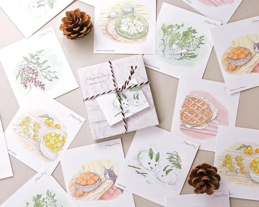 季節を感じるひとコマを絵日記風に描いたメッセージカードです。 プレゼントやおすそ分けの時などに、さりげなく季節感を添えるのにもぴったり。 ケース付きで紐でラッピングしてあるため、このままプチギフトにしたりそれぞれのシーズンのプレゼントにもおすすめです。 *カードの裏面にはシンプルな罫線が入っています *カードの左下にイラストのタイトルがローマ字で入っています 《内容量》1ケース16枚入(8種類の絵柄×各2枚) ◆バリエーションは下記の8種類ございます 《絵柄の内容:SPRING vol.1》ケースの色:イエローオーカー しだれ梅、顔を出すふきのとう、メジロと桜、サラダ野菜の収穫、お団子でひといき、さくらんぼの収穫、たんぽぽとテントウ虫、そら豆の皮むき 《絵柄の内容:SPRING vol.2》ケースの色:若草色 れんげ草、窓辺のハーブ、じゃがいもの収穫、チューリップ畑、ツバメの親子、ふじ棚散策、菜の花と蝶、いちごのジャムできあがり 《絵柄の内容:SUMMER vol.1》ケースの色:サックスブルー 朝顔咲く、ガクアジサイ、梅しごと、涼しげな金魚、ハーブの収穫、畑のナス、スイカでひといき、ほおずきを飾る 《絵柄の内容:SUMMER vol.2》ケースの色:スカイブルー とうもろこしの収穫、レモンシロップづくり、ひまわりと入道雲、夏野菜の収穫、蚊とり線香、実をつけるブルーベリー、みょうがの甘酢漬け、窓辺の風鈴 《絵柄の内容:AUTUMN vol.1》ケースの色:オレンジ 柿の収穫、ススキと秋の空、さつまいもの収穫、ゆずの収穫、夕暮れの赤とんぼ、かぼちゃのタルト、もみじの落ち葉、ぎんなんの殻剥き 《絵柄の内容:AUTUMN vol.2》ケースの色:モスグリーン コスモス畑、ノビタキに出会う、栗拾い、ゆずのジャムづくり、月桂樹とローズマリーの乾燥ハーブ、栗の殻剥き、大学芋でひといき、きのこ狩り 《絵柄の内容:WINTER vol.1》ケースの色:ダークブラウン 毛糸で編み物、サンキライのリースづくり、大根の収穫、りんごのコンポートづくり、白菜の収穫、冬のすずめ、クリスマス気分、寄せ鍋 《絵柄の内容:WINTER vol.2》ケースの色:スノーホワイト ナンテンと雪、コタツにみかん、雪うさぎ、アップルパイでひといき、金柑のジャムづくり、かぶの千枚漬け、椿を飾る、春の七草 - - - MeguruDiary〔めぐるダイアリー〕シリーズ - - - 季節を感じながら巡っていく日々をスケッチしたような、季節感を感じられるデザインに仕上げたシリーズです。 どこか身近でほっとするようなシーンを季節毎に楽しんでいただけます。 - - - - - - - - - - - - - - - - - - - - - - - - - - - - - - - - - - - - -