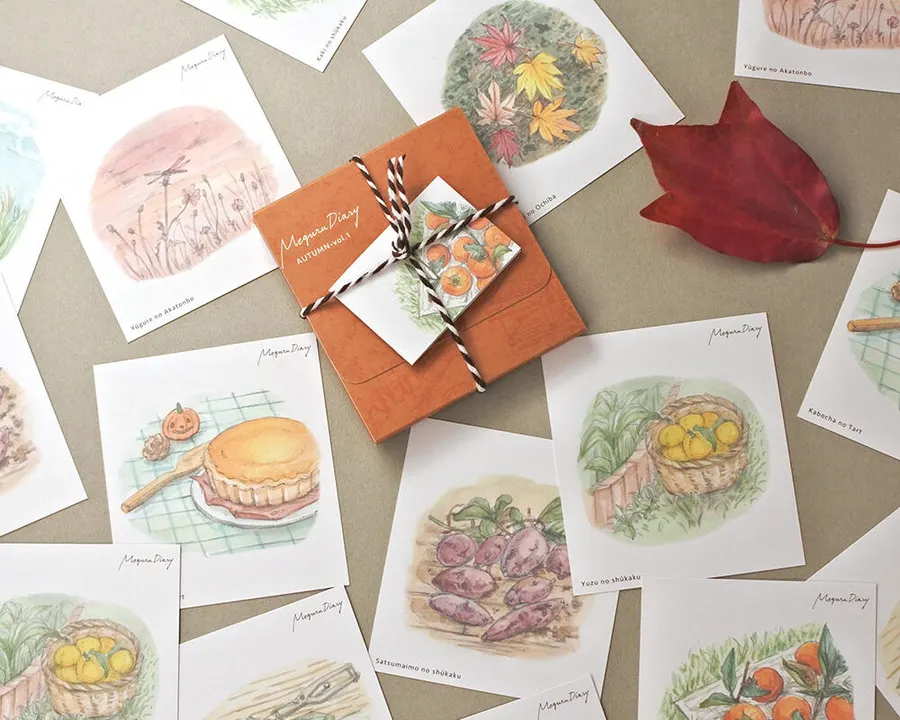 季節を感じるひとコマを絵日記風に描いたメッセージカードです。 プレゼントやおすそ分けの時などに、さりげなく季節感を添えるのにもぴったり。 ケース付きで紐でラッピングしてあるため、このままプチギフトにしたりそれぞれのシーズンのプレゼントにもおすすめです。 *カードの裏面にはシンプルな罫線が入っています *カードの左下にイラストのタイトルがローマ字で入っています 《内容量》1ケース16枚入(8種類の絵柄×各2枚) ◆バリエーションは下記の8種類ございます 《絵柄の内容:SPRING vol.1》ケースの色:イエローオーカー しだれ梅、顔を出すふきのとう、メジロと桜、サラダ野菜の収穫、お団子でひといき、さくらんぼの収穫、たんぽぽとテントウ虫、そら豆の皮むき 《絵柄の内容:SPRING vol.2》ケースの色:若草色 れんげ草、窓辺のハーブ、じゃがいもの収穫、チューリップ畑、ツバメの親子、ふじ棚散策、菜の花と蝶、いちごのジャムできあがり 《絵柄の内容:SUMMER vol.1》ケースの色:サックスブルー 朝顔咲く、ガクアジサイ、梅しごと、涼しげな金魚、ハーブの収穫、畑のナス、スイカでひといき、ほおずきを飾る 《絵柄の内容:SUMMER vol.2》ケースの色:スカイブルー とうもろこしの収穫、レモンシロップづくり、ひまわりと入道雲、夏野菜の収穫、蚊とり線香、実をつけるブルーベリー、みょうがの甘酢漬け、窓辺の風鈴 《絵柄の内容:AUTUMN vol.1》ケースの色:オレンジ 柿の収穫、ススキと秋の空、さつまいもの収穫、ゆずの収穫、夕暮れの赤とんぼ、かぼちゃのタルト、もみじの落ち葉、ぎんなんの殻剥き 《絵柄の内容:AUTUMN vol.2》ケースの色:モスグリーン コスモス畑、ノビタキに出会う、栗拾い、ゆずのジャムづくり、月桂樹とローズマリーの乾燥ハーブ、栗の殻剥き、大学芋でひといき、きのこ狩り 《絵柄の内容:WINTER vol.1》ケースの色:ダークブラウン 毛糸で編み物、サンキライのリースづくり、大根の収穫、りんごのコンポートづくり、白菜の収穫、冬のすずめ、クリスマス気分、寄せ鍋 《絵柄の内容:WINTER vol.2》ケースの色:スノーホワイト ナンテンと雪、コタツにみかん、雪うさぎ、アップルパイでひといき、金柑のジャムづくり、かぶの千枚漬け、椿を飾る、春の七草 - - - MeguruDiary〔めぐるダイアリー〕シリーズ - - - 季節を感じながら巡っていく日々をスケッチしたような、季節感を感じられるデザインに仕上げたシリーズです。 どこか身近でほっとするようなシーンを季節毎に楽しんでいただけます。 - - - - - - - - - - - - - - - - - - - - - - - - - - - - - - - - - - - - -