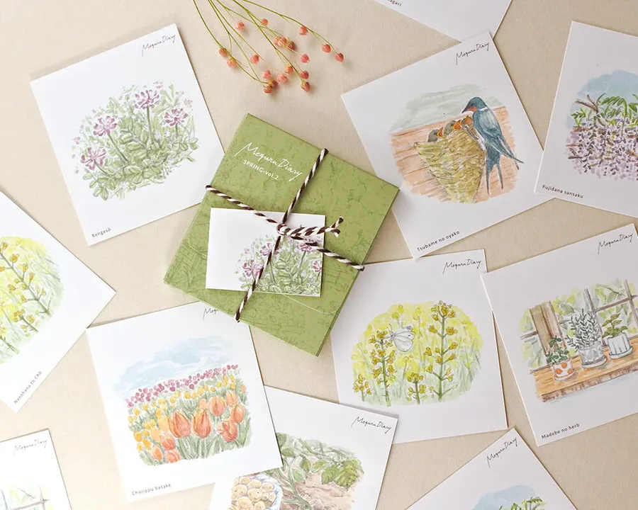 季節を感じるひとコマを絵日記風に描いたメッセージカードです。 プレゼントやおすそ分けの時などに、さりげなく季節感を添えるのにもぴったり。 ケース付きで紐でラッピングしてあるため、このままプチギフトにしたりそれぞれのシーズンのプレゼントにもおすすめです。 *カードの裏面にはシンプルな罫線が入っています *カードの左下にイラストのタイトルがローマ字で入っています 《内容量》1ケース16枚入(8種類の絵柄×各2枚) ◆バリエーションは下記の8種類ございます 《絵柄の内容:SPRING vol.1》ケースの色:イエローオーカー しだれ梅、顔を出すふきのとう、メジロと桜、サラダ野菜の収穫、お団子でひといき、さくらんぼの収穫、たんぽぽとテントウ虫、そら豆の皮むき 《絵柄の内容:SPRING vol.2》ケースの色:若草色 れんげ草、窓辺のハーブ、じゃがいもの収穫、チューリップ畑、ツバメの親子、ふじ棚散策、菜の花と蝶、いちごのジャムできあがり 《絵柄の内容:SUMMER vol.1》ケースの色:サックスブルー 朝顔咲く、ガクアジサイ、梅しごと、涼しげな金魚、ハーブの収穫、畑のナス、スイカでひといき、ほおずきを飾る 《絵柄の内容:SUMMER vol.2》ケースの色:スカイブルー とうもろこしの収穫、レモンシロップづくり、ひまわりと入道雲、夏野菜の収穫、蚊とり線香、実をつけるブルーベリー、みょうがの甘酢漬け、窓辺の風鈴 《絵柄の内容:AUTUMN vol.1》ケースの色:オレンジ 柿の収穫、ススキと秋の空、さつまいもの収穫、ゆずの収穫、夕暮れの赤とんぼ、かぼちゃのタルト、もみじの落ち葉、ぎんなんの殻剥き 《絵柄の内容:AUTUMN vol.2》ケースの色:モスグリーン コスモス畑、ノビタキに出会う、栗拾い、ゆずのジャムづくり、月桂樹とローズマリーの乾燥ハーブ、栗の殻剥き、大学芋でひといき、きのこ狩り 《絵柄の内容:WINTER vol.1》ケースの色:ダークブラウン 毛糸で編み物、サンキライのリースづくり、大根の収穫、りんごのコンポートづくり、白菜の収穫、冬のすずめ、クリスマス気分、寄せ鍋 《絵柄の内容:WINTER vol.2》ケースの色:スノーホワイト ナンテンと雪、コタツにみかん、雪うさぎ、アップルパイでひといき、金柑のジャムづくり、かぶの千枚漬け、椿を飾る、春の七草 - - - MeguruDiary〔めぐるダイアリー〕シリーズ - - - 季節を感じながら巡っていく日々をスケッチしたような、季節感を感じられるデザインに仕上げたシリーズです。 どこか身近でほっとするようなシーンを季節毎に楽しんでいただけます。 - - - - - - - - - - - - - - - - - - - - - - - - - - - - - - - - - - - - -