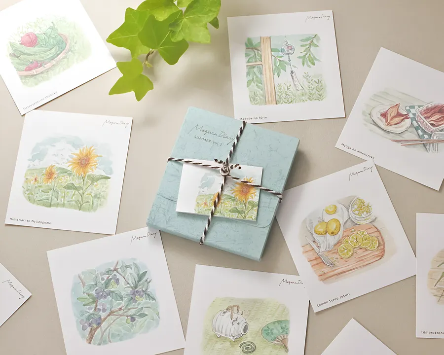 季節を感じるひとコマを絵日記風に描いたメッセージカードです。 プレゼントやおすそ分けの時などに、さりげなく季節感を添えるのにもぴったり。 ケース付きで紐でラッピングしてあるため、このままプチギフトにしたりそれぞれのシーズンのプレゼントにもおすすめです。 *カードの裏面にはシンプルな罫線が入っています *カードの左下にイラストのタイトルがローマ字で入っています 《内容量》1ケース16枚入(8種類の絵柄×各2枚) ◆バリエーションは下記の8種類ございます 《絵柄の内容:SPRING vol.1》ケースの色:イエローオーカー しだれ梅、顔を出すふきのとう、メジロと桜、サラダ野菜の収穫、お団子でひといき、さくらんぼの収穫、たんぽぽとテントウ虫、そら豆の皮むき 《絵柄の内容:SPRING vol.2》ケースの色:若草色 れんげ草、窓辺のハーブ、じゃがいもの収穫、チューリップ畑、ツバメの親子、ふじ棚散策、菜の花と蝶、いちごのジャムできあがり 《絵柄の内容:SUMMER vol.1》ケースの色:サックスブルー 朝顔咲く、ガクアジサイ、梅しごと、涼しげな金魚、ハーブの収穫、畑のナス、スイカでひといき、ほおずきを飾る 《絵柄の内容:SUMMER vol.2》ケースの色:スカイブルー とうもろこしの収穫、レモンシロップづくり、ひまわりと入道雲、夏野菜の収穫、蚊とり線香、実をつけるブルーベリー、みょうがの甘酢漬け、窓辺の風鈴 《絵柄の内容:AUTUMN vol.1》ケースの色:オレンジ 柿の収穫、ススキと秋の空、さつまいもの収穫、ゆずの収穫、夕暮れの赤とんぼ、かぼちゃのタルト、もみじの落ち葉、ぎんなんの殻剥き 《絵柄の内容:AUTUMN vol.2》ケースの色:モスグリーン コスモス畑、ノビタキに出会う、栗拾い、ゆずのジャムづくり、月桂樹とローズマリーの乾燥ハーブ、栗の殻剥き、大学芋でひといき、きのこ狩り 《絵柄の内容:WINTER vol.1》ケースの色:ダークブラウン 毛糸で編み物、サンキライのリースづくり、大根の収穫、りんごのコンポートづくり、白菜の収穫、冬のすずめ、クリスマス気分、寄せ鍋 《絵柄の内容:WINTER vol.2》ケースの色:スノーホワイト ナンテンと雪、コタツにみかん、雪うさぎ、アップルパイでひといき、金柑のジャムづくり、かぶの千枚漬け、椿を飾る、春の七草 - - - MeguruDiary〔めぐるダイアリー〕シリーズ - - - 季節を感じながら巡っていく日々をスケッチしたような、季節感を感じられるデザインに仕上げたシリーズです。 どこか身近でほっとするようなシーンを季節毎に楽しんでいただけます。 - - - - - - - - - - - - - - - - - - - - - - - - - - - - - - - - - - - - -