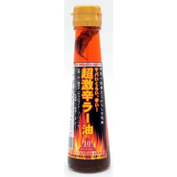 ★テレビ番組(有吉ゼミなど)や、YOUTUBEなどの激辛企画で、しばしば紹介されている超激辛ラー油です!本当にヤバい辛さですので、ご使用の際は分量などにくれぐれもご注意ください。 ★ギネス世界一認定の激辛とうがらしを使用!(キャロライナ・リーパー、ブートジョロキア) ★美味しくて激辛「ただ辛いだけではありません」香味野菜をたっぷり使用した超激辛辣油です! ★辛さは5辛・10辛・15辛・20辛、にんにく5辛・にんにく10辛・にんにく15辛・にんにく20辛の全8種類。20辛は一般的なラー油の50倍以上の辛さです。 ★ラーメン・麻婆豆腐・パスタ・焼きそば・焼き肉中華風冷奴・エビチリ・担担麺・塩焼きそば・おひたし・たこ焼きなど、ぜひお試しください!焼き肉のたれに少し加えたり、味噌汁にもお使いいただけます。豚キムチや鍋料理にも最適です! ★辛い食べ物がお好きな方は是非一度お試し頂きたいラー油です!少しでも辛さが際立つので経済的です。 【原材料・成分】 食用大豆油、唐辛子(キャロライナ―リーパー・ブートジョロキア)、野菜(長ねぎ・生姜)、香辛料、香辛料抽出物 【保存方法】 直射日光、高温多湿を避けて保存してください。