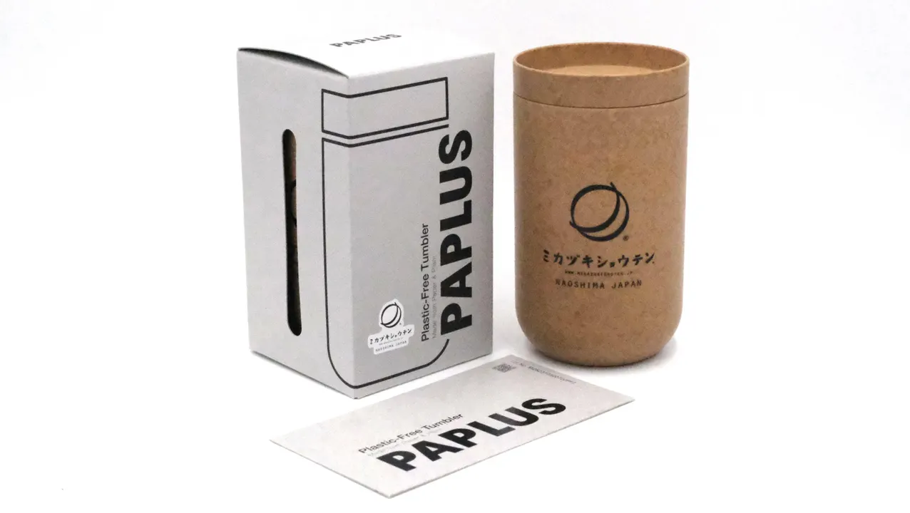 PAPLUS®(パプラス) Plastic-Free Tumbler(プラスチックフリータンブラー) ミカヅキショウテン コラボレーションモデル Lot.No. MZS2310300700PFT 2023年6月より、マットタンブラーとスタッキングタンブラーをお客さま用としてご使用いただいている『ミカヅキショウテン』さん。 お客さまから購入希望を多くいただいたことから販売商品の開発が実現しました。 【ミカヅキショウテン】 〒761-3110 香川県香川郡直島町2291-5 Tel.087-813-1322 https://mikazukishoten.jp/ プラスチックフリータンブラーの原材料は、トウモロコシのデンプンを発酵して得られる乳酸が主成分のPLA(ポリ乳酸)と紙が主原料です。 地球に優しい素材で作ることで、陶器や木材製品のように天然素材独特の風合いとなっており、愛着を持ってお使いいただけるよう色合い、濃淡などの個性を大切にしています。 「マイカップを使いたいがプラスチック製品は避けたい!」 「環境に良いものを使いたいがでデザインも重要…」 という方にお勧めの製品となります。 ■こだわりのデザイン プラスチックフリータンブラーは、独特の素材感を生かすためシンプルなデザインにこだわりました。 タンブラーのサイドのシルエットをストレートにするため金型から後加工にこだわり、最終的に研磨してマットな風合いに仕上げています。 ■パッケージへのこだわり パッケージには新聞や雑誌の古紙からできた100%再生紙である「チップボール」を使用しています。 ■暖かい飲み物もOK 植物由来成分純度の高い製品の多くは耐熱機能を持たないものが多い中、プラスチックフリータンブラーの耐熱温度は120℃ですので安心して暖かい飲み物にお使いいただけます。 ■地球と調和する素材 プラスチックフリータンブラーの約86%は植物由来成分であるトウモロコシ由来の樹脂と紙でできています。 その主成分に、耐熱性機能を担保するために天然の粘度鉱物(約7%)と石油由来の添加剤(約7%)を加えています。 *1 また、素材の大部分は微生物の働きにより水と二酸化炭素に分解されます。*2 *1 最低限使用している添加剤は、厚生労働省が定める食品衛生法に準拠しておりますのでご安心ください。 エコ商材といわれるものの中には添加剤について言及されていないものが多くあります。 ご注意ください。 *2 分解に要する時間や程度は環境により大きく変わりますので100%を保証するものではありません。 ■使い捨てるのではなくリサイクル PAPLUS®製品はゴミとして捨ててしまうと焼却されてしまいます。ほとんど植物由来成分からできているのでカーボンニュートラル(実質的にCO2を増加させない)ですが、ゴミとして焼却するのではなく、資源として回収し、再製品化することにご協力ください。共に新たな循環を作り出していきませんか。 注)リサイクルは日本国内事業のみの対応となります。 PAPLUS®のリサイクルページはこちら https://paplus.jp/recycle/ ■生産から回収・再製品化の過程を公開 プラスチックフリータンブラーには「トレーサビリティカード」が同梱されています。そのカードにはロットナンバーとQRコードが記されており、そこからその製品の製造時期、タイプ、回収・再製品化された数量などサイト上で確認いただけます。 プラスチックフリータンブラー「ミカヅキショウテン コラボレーションモデル」のトレーサビリティページはこちら https://paplus.jp/traceability/mzs2310300700pft/