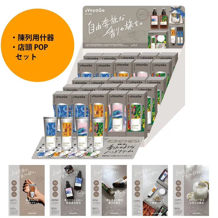 【mifull什器セット】&Voyage ハンドクリーム 10+1(サンプル)個×4種類、陳列用什器、店頭POPのセット
