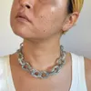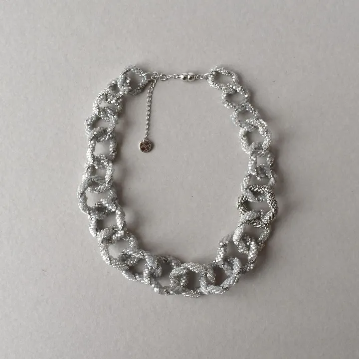 "鎖" 鎖は金属製の環をつなぎあわせてつくった綱です また、物と物とをつなぎあわせることを指します 人と人の心も繋ぎ合わせることができるならば それはとても素晴らしいことです --- カジュアルからドレスまで 合わせやすい鎖のデザインを 小さなビーズで落とし込みました やさしいシルバーの色合いは 大ぶりデザインでも肌になじみます --- material ガラスビーズ、真鍮、マグネット、テグス *シルバービーズはパラジウムッキ加工を施したものを使用しております *留め金具はマグネットタイプを使用しております size 約450㎜+アジャスター50㎜ weight 約29.1g *CACICOの商品は全て1点1点制作しているため、個体差があり、商品写真と差がある場合がございます。ご了承の上、ご購入ください。 *金属アレルギーの方はご使用をお控えください