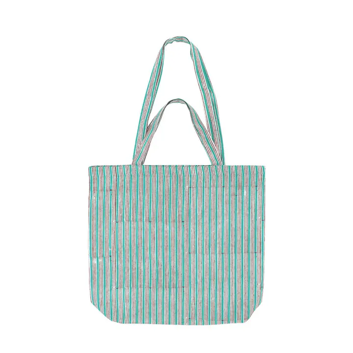 ストライプ柄のおしゃれなブロックプリントシリーズ。 大きくてたくさんものが入るから旅行にピッタリなバッグ。 手提げと肩掛けができる2ハンドルがうれしい仕様です。内布が付いているので中身が透ける心配もありません。 「ブロックプリント」は木版を使って、職人がひと版ひと版、手でスタンプを押すように生地の上にプリントするインドの伝統的な技法です。 ※表示数量を超える在庫や、詳しい納期につきましてはメッセージよりお問い合わせください。