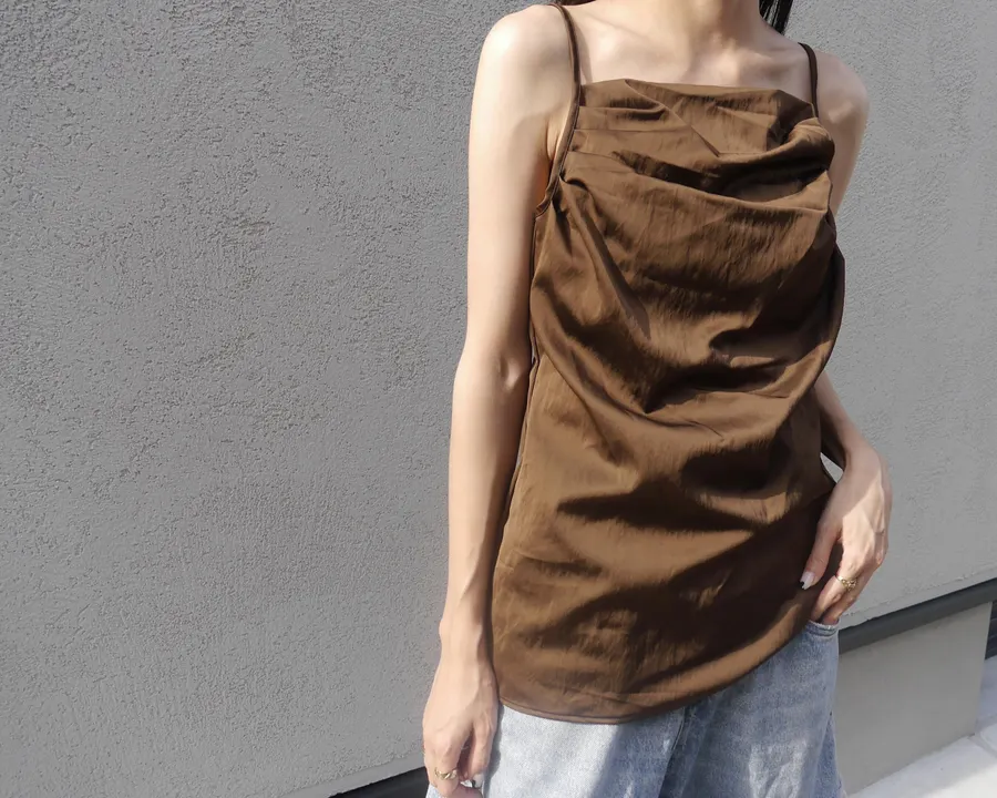 通常ドレスなどのアイテムに使われることの多い程良い肉感を持つこちらのシアーサテンは、数多のメゾンブランドも積極的に採用している素材です。 繊細な表面感とハリのある生地の特性を活かし、前身頃にギャザーを配すことで存在感を高め、立体的で動きのある表情となっています。 後身頃は背中を大きく見せる事で女性らしさを演出しつつ、デニムなどの日常のスタイリングも この1着で昇華することができます。 ショルダーストラップを⻑く取ったnabikiらしいアイコニックディテールはもちろん、左身頃のシームに沿って同色のジップを配すことで着脱のしやすさにも配慮したデザインとなっています。