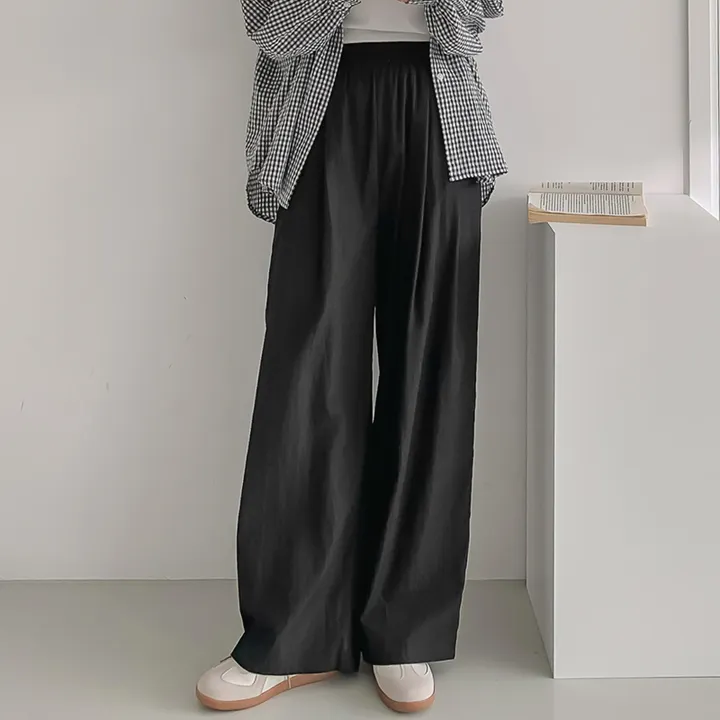 涼しい秋まで楽に着用できるワイドフィットのパンツ、特異な素材でよりトレンドでおしゃれに着用できるワイドパンツ