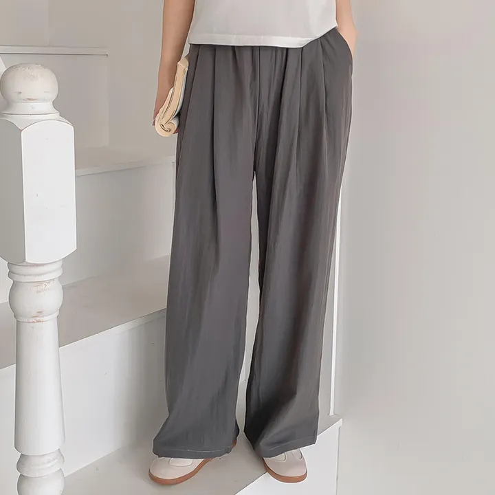涼しい秋まで楽に着用できるワイドフィットのパンツ、特異な素材でよりトレンドでおしゃれに着用できるワイドパンツ