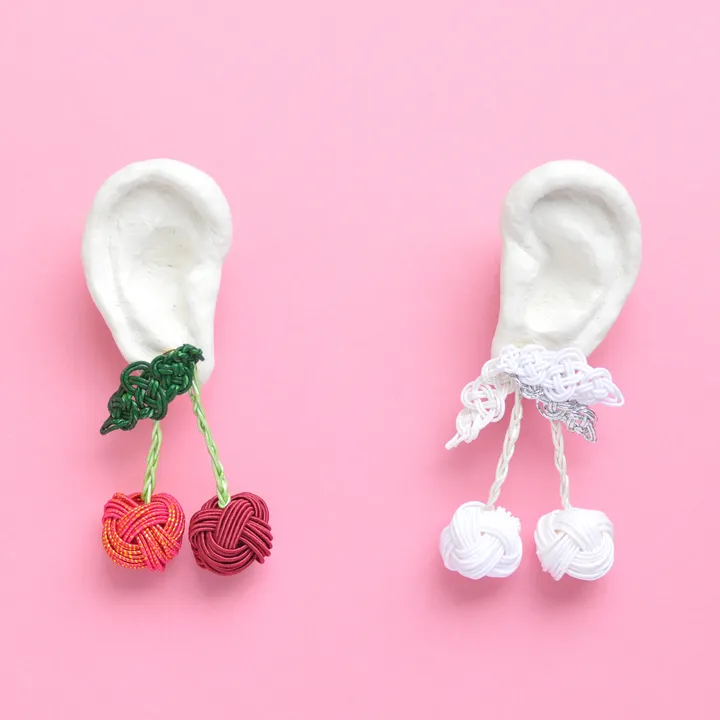 Theme:『The fruits of imagination』 着けたい人、見る人によって色付けされる白いフルーツ。 ーーーーーーーーーーーーーーーーーーーーーーーーーーーー OTUTUMI online shop第二弾のテーマは『空想の産物』。 Fruitsは、果実という意味の他に成果・結果・産物という意味も持ちます。 今回はその両方に掛けてモチーフを選びました。 『空想の産物』とは、現実的ではなく意味や価値がないものという割とネガティブな意味で使用されることが多いですが、今回の作品では空想することで生まれた新しい物語や既存ではあり得ない様な面白いオリジナルの色への想像といったポジティブな意味を表現しようとしています。 脊椎動物全般が持つ、対象物の一部が隠れて見えない時に”欠けた部分”を脳内で補完して全体像を認識するという能力をアモーダル補完と言うらしいのですが、それ、おもしろい!と思い”欠けた部分”というのを”色”に当てはめ、見る者が白色の一片の想像をするというactionをし、脳内で補完、完成する作品にしてみようという試みでもあります。 大ぶりですがとても軽い作りです。 ころころっとまあるいチェリーがとってもcuteですが、落ち着いた色を選んだのでどんなファッションにも合わせやすいです。 水引のお取り扱いについてはFAQを御覧ください。 ●サイズ:H6×W4.5×D2cm ●重さ:4.5g(1片) ●素材:水引(Japanese traditional paper code)、真鍮金具 ーーーーーーーーーーーーーーーーーーーーーーーーーーーー 商品はすべて、画像の様な硬い紙箱にお入れし、水引飾りをお付けいたします。 お品物の大きさにより異なるサイズの紙箱にお入れいたします。 水引飾りは、シーズンによりデザインが変更になります。予めご了承ください。