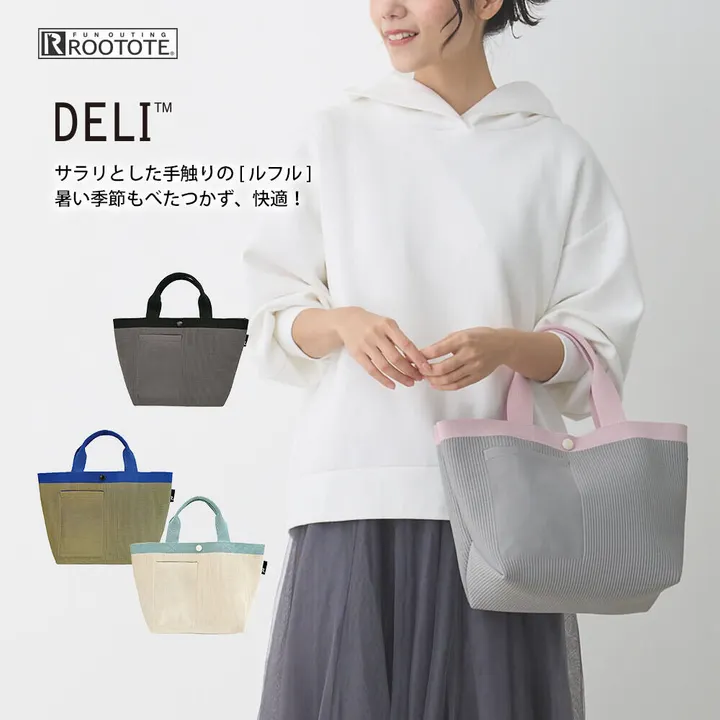素材をフル活用したルートート「ルフル」。 サラリとした手触りは暑い季節にもベタつかず、快適。 ニットなのにハリがあり、自立するのも魅力です! トートバッグのパターンにあわせて、パーツごとに生地を編み立てます。 製造時の端材が出ず、生地端の処理も不要。 無駄の少ない製法でつくられました。 必要な分だけパーツを用意し、素材をフル活用しています。 シンプルな形状ながら、本体と持ち手のバイカラーがポイント! 普段使いにちょうどよい「デリ」サイズ。 見た目以上のたっぷり容量。 お財布、ボトル、A5ノート、ポーチなどらくらく収納! 体に添うやわらかさがありながら、自立するシルエット。 大きく開く口元で、モノの出し入れがしやすく、中身もパッと確認できます。 スマホやハンカチが入る内ポケット付き。 前面のルーポケットは、本体と一体で編まれている縫い目のないポケット。 出し入れ頻度の高い小物を入れておくのに便利です。 いつでも清潔に。 洗濯可能で、衛生的にご利用いただけます。 季節を問わず大活躍です。
