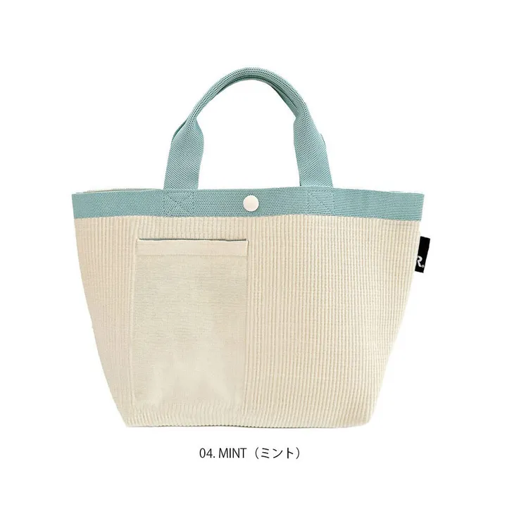 素材をフル活用したルートート「ルフル」。 サラリとした手触りは暑い季節にもベタつかず、快適。 ニットなのにハリがあり、自立するのも魅力です! トートバッグのパターンにあわせて、パーツごとに生地を編み立てます。 製造時の端材が出ず、生地端の処理も不要。 無駄の少ない製法でつくられました。 必要な分だけパーツを用意し、素材をフル活用しています。 シンプルな形状ながら、本体と持ち手のバイカラーがポイント! 普段使いにちょうどよい「デリ」サイズ。 見た目以上のたっぷり容量。 お財布、ボトル、A5ノート、ポーチなどらくらく収納! 体に添うやわらかさがありながら、自立するシルエット。 大きく開く口元で、モノの出し入れがしやすく、中身もパッと確認できます。 スマホやハンカチが入る内ポケット付き。 前面のルーポケットは、本体と一体で編まれている縫い目のないポケット。 出し入れ頻度の高い小物を入れておくのに便利です。 いつでも清潔に。 洗濯可能で、衛生的にご利用いただけます。 季節を問わず大活躍です。