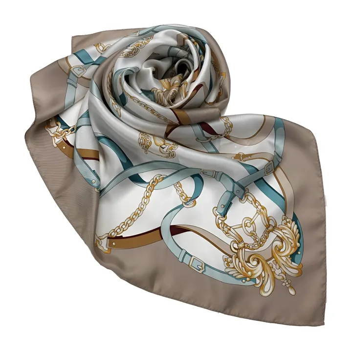 プリントから縫製まで全て国内で加工を施した日本製シルク100%のスカーフ。クラシック感のある馬具などのモチーフをパステルカラーを基調にしたプリントでゴージャス感ある1枚に仕上げています。 旅行やお出掛け、仕事だけでなく、フォーマルな場にも首元を飾るアクセントとして最適です。 スカーフは首に巻くだけではなく、ターバンとして頭に巻いたり、ベルト代わりに腰に巻くことも出来ます。 また、アクセサリーとしてカバンに巻くのもお薦めです。 首元が寂しくなりがちな春夏のコーディネートのアクセントや日焼け防止対策にもぴったりです。