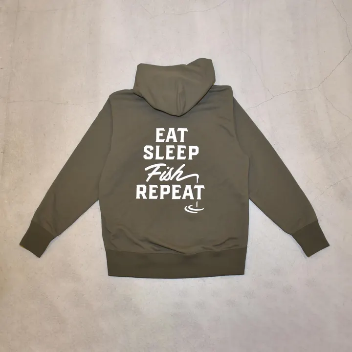 「EAT SLEEP FISH REPEAT®︎」。私たち釣り人の「生活」そのものです。 コットンタッチポリエステルによる乾くスウェットフーディー(パーカー)に、デザインされた「EAT SLEEP FISH REPEAT®︎」のキャッチコピーを背中にプリントしました。しっとりと柔らかく着心地の良いまるでコットンのようなポリエステルの裏毛は、高い吸水性と速乾性を兼ね備えています。 「釣り」に取り憑かれた私たち釣り人の生活は、だいたいこんな感じ。 「EAT」「SLEEP」「FISH」「REPEAT」たった4ワードでシンプルに表現しました。 「ロッドから垂れた糸」「波紋」で「釣りのシーン」も表現。 シンプルながらもメッセージ性が高いデザインに仕上げました。 釣り場で釣りをしている際にもアピールできるように「バックプリント」にいたしました。 乾きが早いので、遠征にもオススメ。 この商品のボディにはBRING Material™(再生ポリエステル)を25%使用しています。 BRING Material™は、服から服をつくるBRING™が、使われなくなった服を消費者から回収する活動を様々なブランドと連携して実施し、回収した服のポリエステルを独自のBRING Technology™により化学的にリサイクルし、まったく新しいポリエステル原料に生まれ変わらせたサスティナブルな再生ポリエステル樹脂です。この樹脂を原料にすることでバージン品質と同等の糸や生地を作ることが可能です。  BRINGについて BRING™は服から服をつくるために、使われなくなった服を消費者から回収する活動を様々なブランドと連携して行っています。回収した服のポリエステルは独自のBRING Technology™により化学的にリサイクルされ、まったく新しいポリエステル原料に生まれ変わります。この原料を加工してつくられた糸や生地などのサスティナブル素材がBRING Material™です。ポリエステル以外の原料も可能な限り資源にまで再生しています。 ※商品の色は「モニターの設定や再現性」「撮影時の光源」「実際の商品を見る際の光源」などが原因で、実際の商品の色と異なって見える場合がございます。あらかじめご了承くださいませ。 ※できる限り印刷位置がずれないように配慮しておりますが、シルクスクリーン印刷の特性上、印刷位置がわずかにずれる場合がございます。製造の都合上避ける事ができませんので、あらかじめご了承くださいませ。 ※製造誤差及び測定誤差により、記載のサイズや重さと誤差が生じる場合がございますが、製造の都合上避ける事ができません。 -- ※「BRING™️」および「BRING Material™️」「BRING TechnologyBRING Material™️」は日本環境設計株式会社の登録商標です。 ※「EAT SLEEP FISH REPEAT®︎」は株式会社GOODIEの登録商標です。