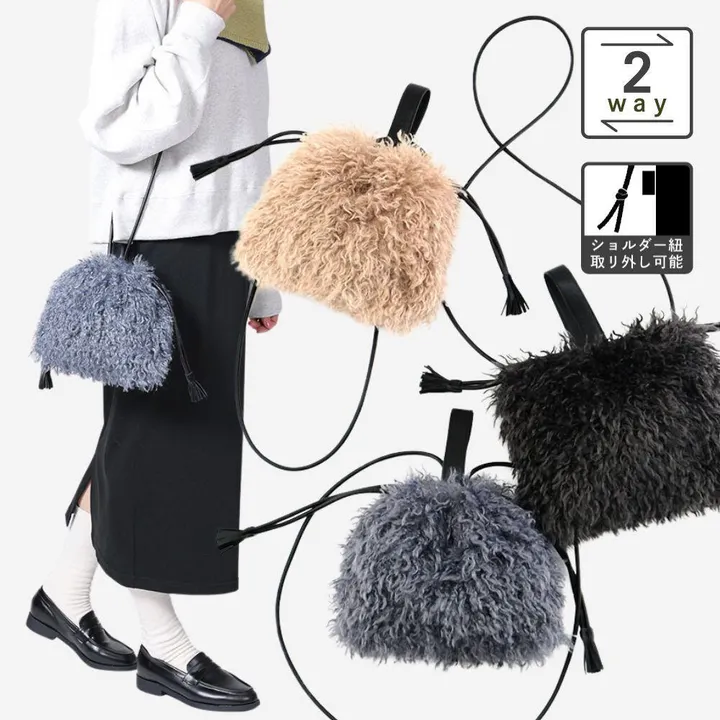 ショルダーとハンドバッグの2WAYバッグ。巾着紐の先端のタッセルや、長さ調整できるショルダー紐など細かなところ1つ1つにこだわったバッグです。 毛足の長いファーはアクセサリー感覚でポイントになりつつ、スマートフォン、お財布、ミニポーチなどが入る収納力も魅力です。 動物保護の観点から生まれたフェイクファーは、デザインやカラーバリエーションが豊富な為、ファッションからインテリアに至る様々なアイテムに使用されています。耐久性に優れており、適切なお手入れをすれば永くご愛用いただける環境にやさしい素材です。 この製品は、日焼け、汗や水に濡れた場合の摩擦により、他の物への色移りや変色する場合がありますのでご注意ください。 *ショルダー紐取り外し可能 *内ポケット×1