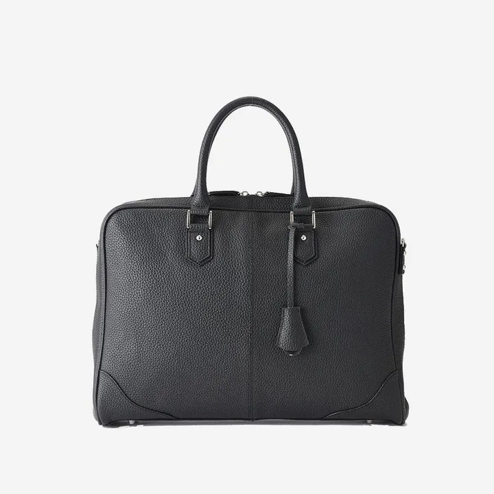 独特のエレガントな風合い・手触りが魅力のシュリンクレザーを贅沢に使用し、ビジネスシーンでの格式を上げる、美しいフォルムを追及したビジネスバッグ。 ファスナーの可動域を両脇まで広げたフルオープン構造のデザインに、内側には13インチが入るPCケースと小物収納のポケットがあり機能性も十分です。ショルダーストラップ付き。