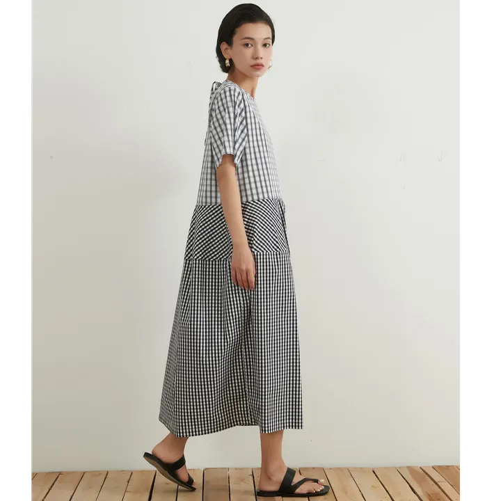 ガラ違いのチェックを組み合わせて仕上げた布帛のドレス。たくさんあるチェック柄の中から本当に合わせて可愛いなと思った柄を厳選いたしました。何度も試行錯誤を繰り返し、作製に時間をかけたアイテムです。両サイドポケット付きでとても着やすくさらっと被れる着心地良い一枚です。首後ろのリボンディテールもとても可愛いです。 サイズ  着丈  バスト  肩幅  ウエスト  袖丈(cm) FREE   119.5  96   36.5   100    23 素材:綿72% ナイロン25% ポリウレタン3% 透け感:なし 生地の厚さ:普通 光沢感:なし 裏地:なし 家庭洗濯:可能(ネット使用) 【注意点】 ※撮影商品はサンプルの為、実際の仕様と異なる場合がございます。 ※画像の商品は光の照射や角度、お使いのモニター環境により、実物と色味が異なる場合がございます。スタジオ物撮りの画像が実物の色味に一番近くなっております。 ※予約商品の場合、お届け予定はあくまでも目安となります。 生産の都合上、お届け時期がずれる場合がございますので、あらかじめご了承ください。 ※表記サイズは商品の実寸です。 ※布製品の特性上、サイズ表の実寸法は多少の誤差が生じる場合がございますので、予めご了承ください。 #ononesown#チェックワンピース#半袖ワンピース#シルエット#ポケット付き#サステナブル#エシカル