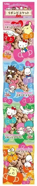 ●サンリオキャラクター(ハローキティ・マイメロディ・リトルツインスターズ・ポムポムプリン・けろけろけろっぴ・バッドばつ丸・ポチャッコ・シナモロール)の8キャラクターがデザインされたパッケージ。 ●リボンの形の小さなビスケットには、パペットのように描かれたキャラクターがプリントされています。 ●北海道産牛乳のやさしい味わい。