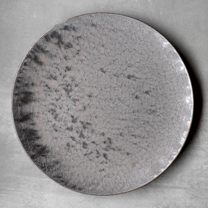 大地の力強さをそのまま閉じ込めたようなプレート。 縁のわずかな立ち上がりが、料理をしっかりと受け止めながらも、余白を美しく残します。 マットな黒の中に潜む光が、光の温度によって金にも銀にも変化し、炎の余韻を感じさせる煌めきが料理を包み込みます。 グリル料理やソテーなど、火の香りを纏う皿に最適です。 ◆ 商品概要 縁がわずかに立ち上がったφ255xh25mmのプレート。 フラットさと安定感を兼ね備え、メインから前菜、ワンプレートまで幅広く対応します。 ◆ この器が生まれた背景 黒曜シリーズは、大地の力強さと黒曜岩の輝きからインスパイアされました。 マットな黒に、光の角度で浮かび上がるゴールドやシルバーの煌めきは、料理に唯一無二の舞台を与えます。 ◆ この器でできること ・ソースを美しく収め、盛り付けに余韻を残す ・立ち上がった縁が料理をフレーミングし、構成を際立たせる ・和洋を問わず料理が映える万能な一枚 ◆ おすすめの使い方 ・肉や魚のメインディッシュ ・前菜の盛り合わせをアートのように構成 ・パスタやリゾットをモダンに演出 ◆ こんな方におすすめ ・料理の「完成度」を一段上げたい料理人 ・ワンプレートでも立体感と余白を大切にしたい方 ・シグネチャーディッシュの表現力を高めたい方 ◆ 商品の特徴まとめ ・φ255xh25mmの程よい深さ ・縁が料理を包み、余韻を演出 ・黒曜釉薬の輝きがドラマティックに料理を引き立てる ・汎用性が高く、コースからアラカルトまで活躍