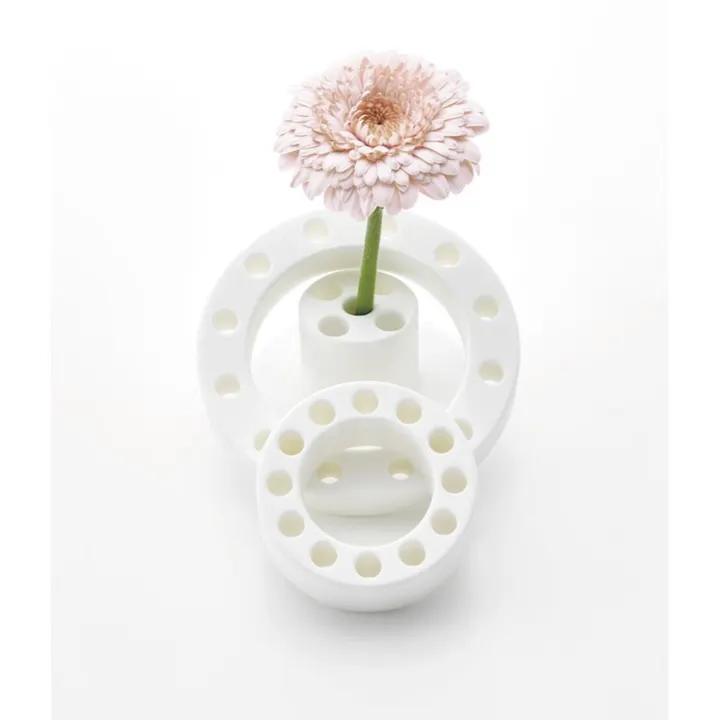 3パーツが重なった三段の花留めで、バラして使用することで変化を付けられます。 異なる大きさの穴があり茎の太さが異なるお花も一緒に生けることができます。 直径35mm中心のパーツは単体で細めの花器に合わせることで、茎の細い、背の高いお花も安定させることができます。 1、茎を傷付けず、セラミックの効用で水を綺麗に。お花が長持ちする、セラミック製のフラワーホルダー(花留め)は丈夫で繰り返し使用できるサステナブルなアイテムです。 2、初心者でも、切り花をぽんぽん挿すだけで簡単にフラワーアレンジが楽しめます。華道のプロのアドバイスも受け設計しているので、いけばなをされる方にもおすすめです。 3、東京で創業し今年55年目となるセラミック部品メーカー「セライズ」の、セラミックの特長を知り尽くした女性社長が開発しています。