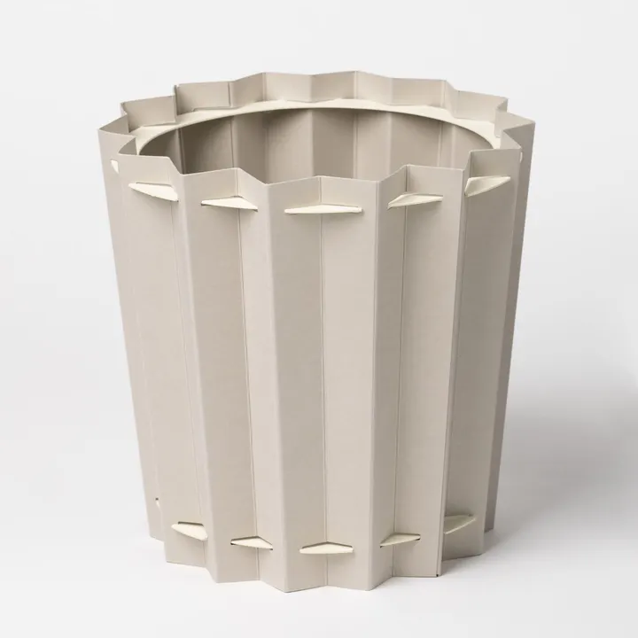 紙器設計で培った紙を留めたり、嵌めたりする技術が存分に生かされています。美しい色の紙を使っていて、インテリアの空間に馴染みながらアクセントになる佇まい。分厚くしっかりとした紙を使っているので丈夫です。 子供のおもちゃやぬいぐるみ、スリッパ入れなど、その他にも様々な小物を収納できます。 紙ごみいれとしても活躍する、とても自信作の商品です。 ZIGZAG BOXは、先行してプロトタイプを1月のパリで展開したアイテム。 メゾン・エ・オブジェという世界最高峰のインテリア・ライフスタイル商品が集う展示会でお披露目しました。 この商品は最も注目され、自分たちの予想を大きく上回る方々から引き合いをいただきました。 ※組立式(本体パーツに、底パーツと、ドーナツ上の開口部パーツを嵌め合わせます)