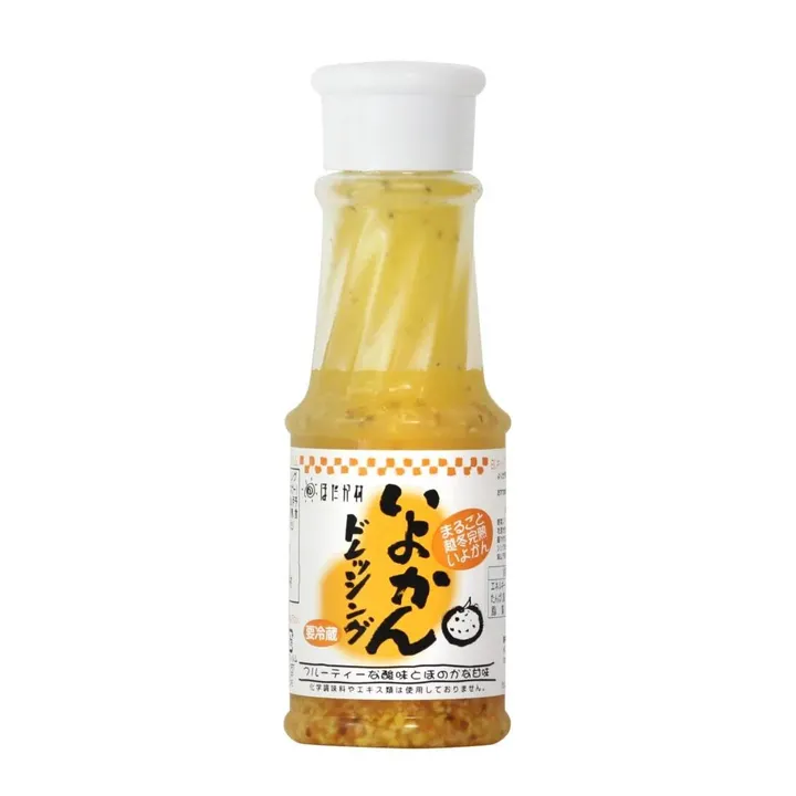 愛媛の「越冬完熟伊予柑」と特注の昆布酢で作った爽やかなドレッシング。 伊予柑の果汁と皮をまるごと使った、さらっとさわやかでフルーティな酸味が美味しい 愛媛ならではの「いよかんドレッシング」になりました。 さっぱりと食べたい料理やマリネにおすすめ。