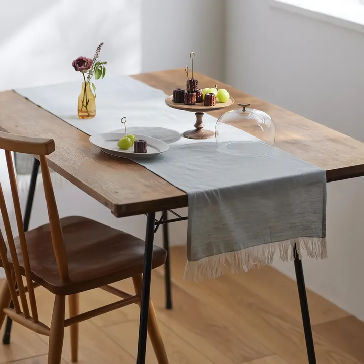 手紡ぎ手織りのカディで作られたテーブルセンター。 経糸と横糸の色が異なるシャンブレーで織り上げ、シャンブレー特有の色の奥行きによって微妙な表情を変え、シンプルながらも洗練された印象を与えます。