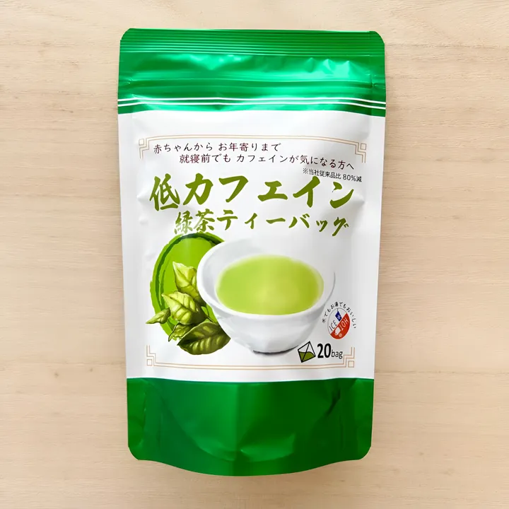 【何も足さない、何も引かない、自然を活かした 完全無添加の低カフェイン茶】 立春から啓蟄の間(立春を過ぎた頃)の 茶の樹のカフェインが最も少なくなった季節に摘み取った茶葉を使用。 【デカフェ、カフェインレス、ノンカフェインとの違い】 ・デカフェは、茶葉中のカフェインを何らかの方法で除去したものです。  (カフェインを除去する際に旨味や香りなどの有用成分も除去されてしまう) ・カフェインレスは、デカフェとほぼ同じで90%以上のカフェインを除去したもの。 ・ノンカフェインは、もともとカフェインを含んでいないもの。  ※緑茶やコーヒーでは、その様なものはありません。 ■当店の低カフェイン茶は物理的方法でカフェインなどの成分を除去していません! ■お茶本来の味や香りを楽しめます! ■カフェイン含有量は、当社従来品比80%減(成分検査済み) 【赤ちゃんからお年寄りまで 就寝前や カフェインが気になる方へ】 ※小さいお子様に与える場合は、水の割合を増やすなど 濃さを調節してください。 【特徴】 ・粉末緑茶…1袋で約100杯分!お湯または水で溶けるタイプ。       すぐに飲める!味が濃い。       茶殻がでないので後片付けも簡単。       時間が経つと粉末が沈殿します。 ・緑茶ティーバッグ…茶葉が広がる三角ティーバッグ使用。           水出しでカフェインの抽出をより抑制できます。           冷蔵庫で作り置きができます。           さっぱりとした飲み心地で、おいしく飲めます! ・ほうじ茶ティーバッグ…茶葉が広がる三角ティーバッグ使用。             水出しでカフェインの抽出をより抑制できます。             冷蔵庫で作り置きができます。             えぐみ のないさっぱり香ばしい味!             小さいお子様にもおすすめ。