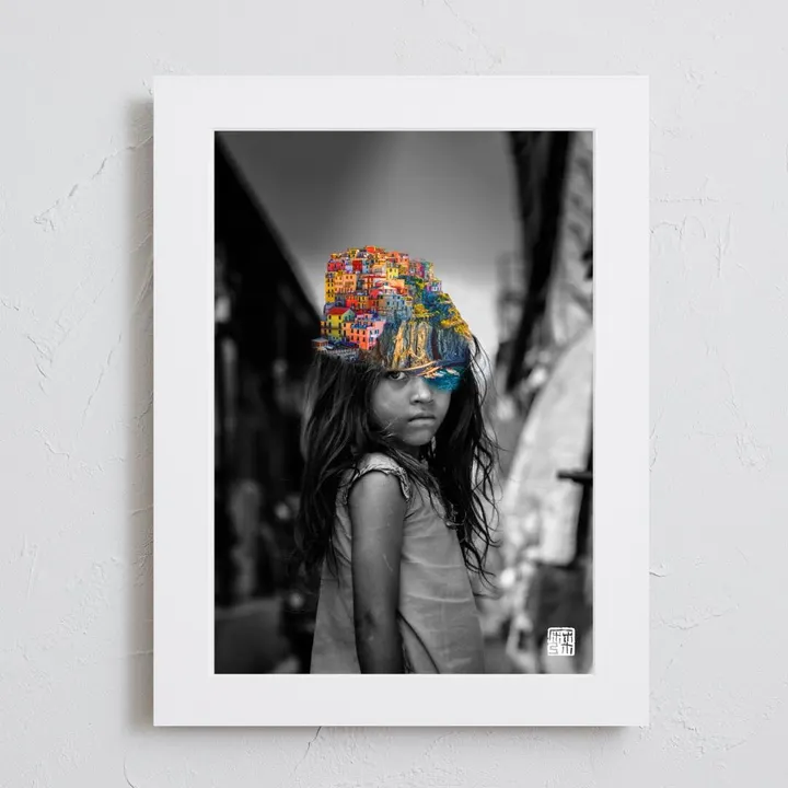 アーティスト -PROFILE- 藤本 麻弥 / Maya Fujimoto(マヤ フジモト) 2000年よりスペインの国境付近のフランス在住 リゾート地の観光局で広告デザイン全般を担当 人の価値観を変える事、さまざまな色や形で溢れ出る感情や世の中の傷、 生きる歓喜と哀しみのようなメッセージを表現したいと思っている。 主に雑誌の切り抜きや折り紙を使ったアナログコラージュ、 フォトショップを使ったデジタルコラージュを世界に発信する。 【作品について】 白黒のモノクロの色味がない少女の写真。 真っ直ぐと見つめる視線に何を思う? 彼女の頭には幻想的で鮮やかで美しい海外の街並みが 作品名:village 手法:写真、デジタルコラージュ ペーパー:高品質半光沢紙 マットカラー:白 マット*:DXホワイト芯 100%バージンパルプ/PH7・中性紙(2mm厚) ※全てのアートにマットがつきます フレームカラー:黒、白、無垢(3種類から選択) ※マット付のため通常とはフレームサイズが異なる規格となります。 【マット*とは?】 アートポスターの周りに挟んだ厚紙の事。 マットを使わない時に比べ余白により広がりが生まれ、作品の新たな一面を引き出せ作品の見栄えがグッと良くなります。また、額縁のガラス面と作品が直接触れたままにしておくと、くっついて作品を傷つけることがあります。マットを使用することでガラスと作品の間に空間ができ、作品を保護することができます。ブランドコンセプトにより全てのアートにマットがつきます。 ー ファッションのようにアートを ー 私達が掲げるコンセプトです! 毎日着替えるファッションの様に、アートも気軽に飾り変えて欲しい... 一旦飾り終えたアートにも光を当ててほしい... ポスター単体、またはリピートで中身だけのポスターを購入された方に"専用のハンガー"をセットでお届け。 「今までに無い!新しいアートの飾り方を提案」 飾る事がなくなった前のアートをハンガーにかけて洋服と一緒にかけてもらう。 その日の気分や、モチベーションですぐに取り換えられる様に。 もちろん、魅せる収納としても今までにないおすすめの飾り方です。