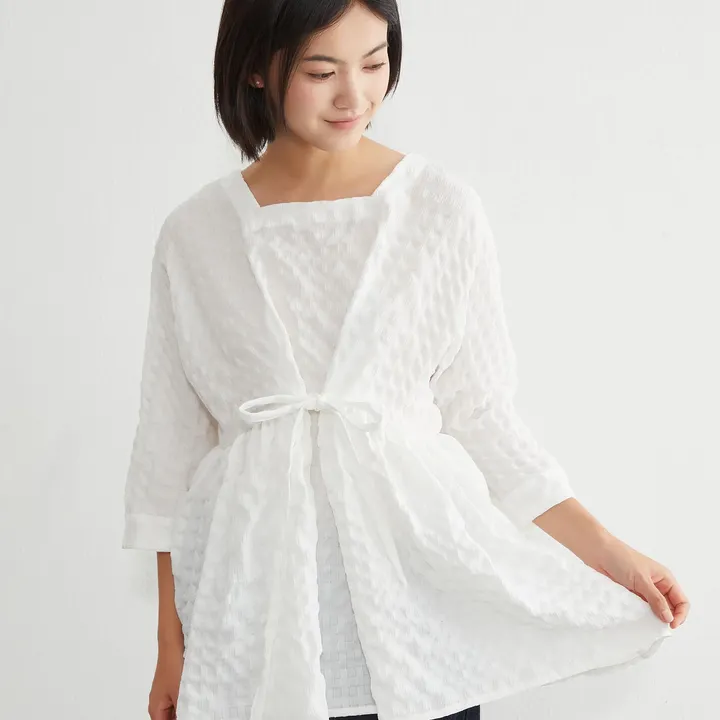 ポコポコ感のある表面は、触り心地が豊かで立体感をもたらし、シーズンを問わずスタイリッシュな印象を与えます。通気性がありつつ、しっかりとした質感が特徴で、長時間着用しても快適な着心地を提供します。 スクエアネックラインが女性らしいエレガンスを引き立て、前面のリボンがトップスに独自のアクセントを加えます。前リボンを結ぶことで生まれる畳んだタックの仕様。これにより、レイヤード感が生まれ、立体的でおしゃれな印象を与えます。シンプルながらも遊び心あるデザインが、ファッション愛好者に喜ばれることでしょう。 コーディネートの提案: このトップスはその独自のデザインにより、一枚で存在感を放つことができます。デニムスキニーやワイドパンツとの相性が良く、カジュアルなデイリーコーディネートにもぴったりです。また、スカートと合わせても女性らしさが引き立ちます。羽織りものをプラスしても良いですし、シーズンによってはジャケットとの相性も抜群。おしゃれなレイヤードスタイルを楽しんでください。 #チェック#ギンガムチェック#七分袖#スクエアネック#リボン#2WAY#タック#レトロガーリー#春夏#レディース#春服#新作#黒