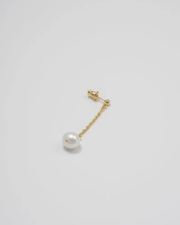 "Pearl" series 淡水パールとK18ゴールドコーティングチェーンのピアス。 耳元で垂れ下がるフォルムが特徴的なピアス。 揺れ動くデザインで顔まわりをパッと華やかにしてくれます。 シンプルな一粒パールはクールな印象を演出し、男性でも着けやすいパールアイテムとなっております。 SILVER925(sterling silver)の上にK18をコーティングし、メタルの上質さがプラスされることで、ワンランク上のゴールドカラーとしてお使いしていただけます。 ※片耳販売です。