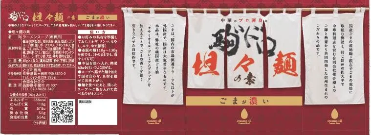 中華のプロ渾身の手作り担々麺スープの素です。本場の担々麺に寄せたドロッとした混ぜそば風ながらも、辛さ控えめでごま感を強調した自信作です。 市場流通0.1%以下の希少な国産ごまの産地である駒ヶ根市の弊社と、同じく信州の佐久平で中華料理店を営む合同会社佐介様とのご縁と熱意から共同開発し、決め手に弊社の純国産ごま油「セサミオイル・プレミアムブラック」を用いることでごまの風味を引き立たせました。 ①1食分のスープの素へ熱湯60㏄を加え混ぜます。 ②そこへ茹でた麺(そのままでも、冷やしでも可)を加え混ぜ合わせたら、お好みのトッピング(メンマ、ネギ、茹でた豚肉など)で完成。 ※麺は市販の麺110g~130g又は、うどんも可。残ったスープに白飯を加えてお召し上がりいただけます。 1箱4食入り(スープのみ) 駒゛の文字は駒ヶ根市が商標登録しており、許可を得て使用しています。