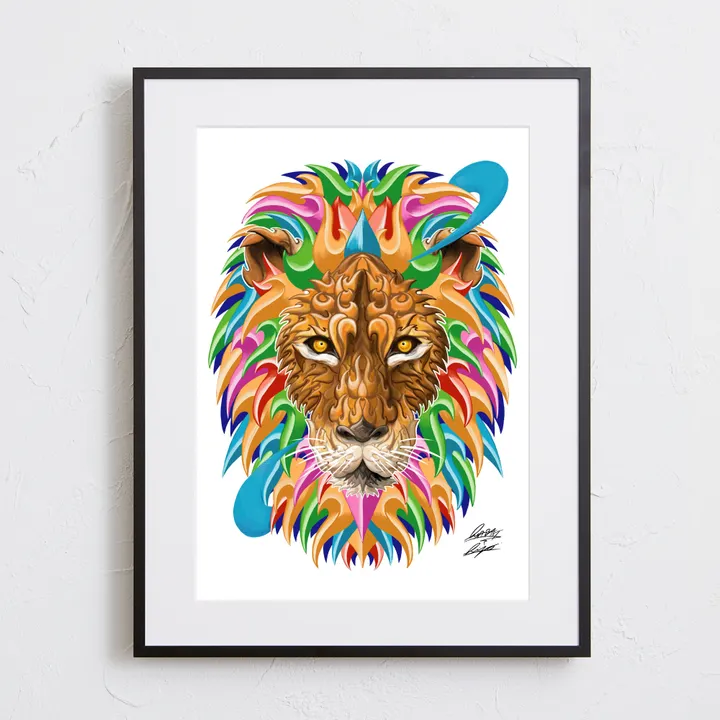 アーティスト -PROFILE- Madblast Hiro(ヒロ) 岐阜県出身。ライブペインター / アーティスト 2021年には大阪府の貝掛中学校の皆様と長さ230mの壁画を制作。 岐阜駅前の繊維問屋街では高さ16mの壁画を制作の他、G-SHOCKやSONY、BETONES等に作品提供を行う。 独自の模様をブロックのように積み上げる表現を突き詰める。 【作品について】 カラフルな色使いはMadblast Hiroの得意とする表現方法の一つ。 迫力あるライオンは今にも飛び出してきそうな、躍動感を感じます。 作品名:Mad Lion 手法:イラスト、デジタル ペーパー:高品質半光沢紙 マットカラー:白 マット*:DXホワイト芯 100%バージンパルプ/PH7・中性紙(2mm厚) ※全てのアートにマットがつきます フレームカラー:黒、白、無垢(3種類から選択) ※マット付のため通常とはフレームサイズが異なる規格となります。 【マット*とは?】 アートポスターの周りに挟んだ厚紙の事。 マットを使わない時に比べ余白により広がりが生まれ、作品の新たな一面を引き出せ作品の見栄えがグッと良くなります。また、額縁のガラス面と作品が直接触れたままにしておくと、くっついて作品を傷つけることがあります。マットを使用することでガラスと作品の間に空間ができ、作品を保護することができます。ブランドコンセプトにより全てのアートにマットがつきます。 ー ファッションのようにアートを ー 私達が掲げるコンセプトです! 毎日着替えるファッションの様に、アートも気軽に飾り変えて欲しい... 一旦飾り終えたアートにも光を当ててほしい... ポスター単体、またはリピートで中身だけのポスターを購入された方に"専用のハンガー"をセットでお届け。 「今までに無い!新しいアートの飾り方を提案」 飾る事がなくなった前のアートをハンガーにかけて洋服と一緒にかけてもらう。 その日の気分や、モチベーションですぐに取り換えられる様に。 もちろん、魅せる収納としても今までにないおすすめの飾り方です。